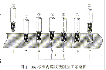 图1所示加工工位流程为:①位,螺纹钻铣刀快速运行至工件安全平面;②位,螺纹钻铣刀钻削至孔深尺寸;③位,螺纹钻铣刀快速提升到螺纹深度尺寸;④位,螺纹钻铣刀以圆弧切入螺纹起始点;⑤位,螺纹钻铣刀绕螺纹轴线作X、Y方向插补运动,同时作平行于轴线的+Z方向运动,即每绕螺纹轴线运行360°,沿+Z方向上升一个螺距,三轴联动运行轨迹为一螺旋线;⑥位,螺纹钻铣刀以圆弧从起始点(也是结束点)退刀;⑦位,螺纹钻铣刀快速退至工件安全平面,准备加工下一孔。该加工过程包括了钻孔、 倒角、内螺纹铣削和螺纹清根槽铣削,采用一把刀具一次完成,加工效率极高。