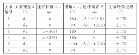 关节编号关节变量θi(°)连杆长度ai-1mm扭角αi-1(°)连杆偏置dimm关节转角极限(°)1θ10180d1(-98.5)±1752θ2090d2(-121.5)±1753θ3a2(408)1800±1754θ4a3(376)1800±1755θ50-90d5(-102.5)±1756θ60900±175