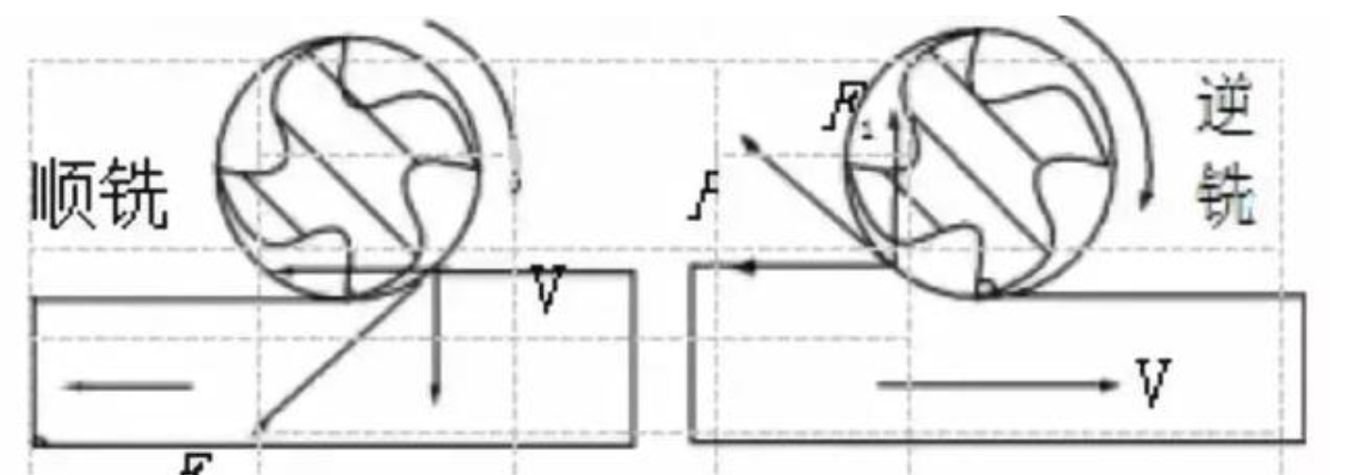 如下图所示,刀具切削速度与工件移动方向相同的为顺铣,刀具切削速度与工件移动方向相反的为逆铣。
