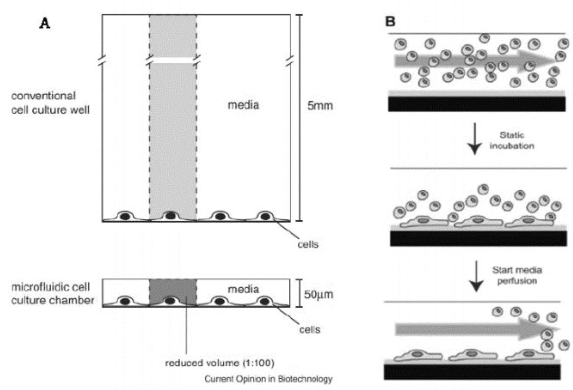 B:悬浮细胞在微通道中培养,为使细胞贴壁需要经历一段静止期,然后再进行灌注培养。