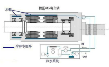电主轴的冷却:由于电主轴将电机集成于主轴单元中,且转速很高,运转时会产生大量热量,引起电主轴温升,使电主轴的热态特性和动态特性变差,从而影响电主轴的正常工作。因此,必须采取一定措施控制电主轴的温度,使其恒定在一定值内。机床目前一般采取强制循环油冷却的方式对电主轴的定子及主轴轴承进行冷却,即将经过油冷却装置的冷却油强制性地在主轴定子外和主轴轴承外循环,带走主轴高速旋转产生的热量。机床另外,为了减少主轴轴承的发热,还必须对主轴轴承进行合理的润滑。