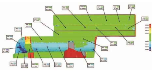 C3604黄铜材料单价高,为降低成本,减少被切削材料体量,选择棒料为毛坯,并采用三爪自定心卡盘更好地控制零件的位置精度。因为材料是黄铜,对刀具无太大的要求,直接选择普通的硬质合金刀具对其进行加工。此外,为了保证加工质量和合格率,专门制定了合理的加工工艺方案,采用五轴加工中心一次成形。表1所示为程序工艺单,程序模拟时间为1h15min10s,实际加工时间为2h10min。零件加工完成后,根据图样要求进行尺寸和位置精度检测。为了保证检测数据的准确性,采用工业扫描仪检测。图3所示为检测报告。