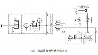 考虑到失电安全,失电后夹紧的工件不应掉落,故电磁阀采用双电控。末端执行器气动控制回路如图5所示。当YV1电磁阀线圈通电时,气动手爪收缩,夹紧工件;当YV2电磁阀线圈通电时,气动手爪松开,释放工件;当YV1、YV2电磁阀线圈都不通电时,气动手爪保持原来的状态。电磁阀不能同时通电。